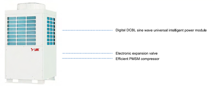Adopting DC PM motor, efficient and saving energy, the fan adopts stepless speed changing to change according to outdoor temperature or load and realize reliable refrigerant pressure control.